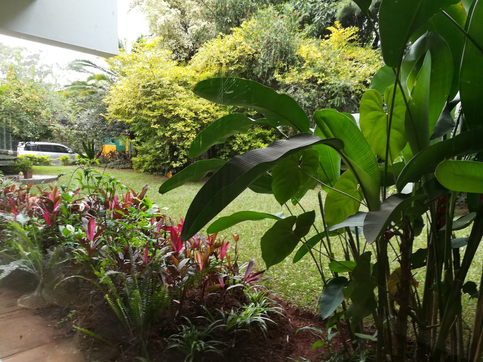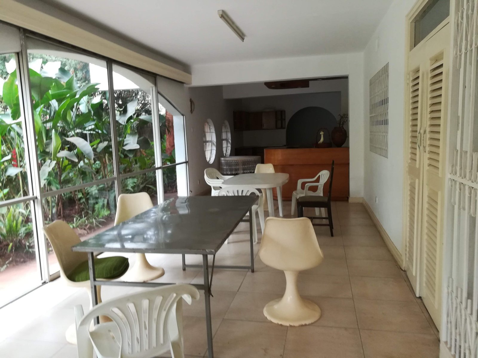 - Patio overlooking a plush garden with drinks serving area